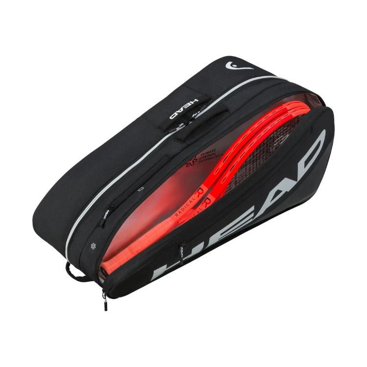 De Tour 9R L biedt ruimte voor maximaal negen rackets. Het mesh-vak binnenin en een vak aan de buitenkant bieden extra ruimte voor bijvoorbeeld accessoires of schoenen. Met het unieke draagsysteem kun je kiezen of je de tas over je schouder of op je rug draagt voor extra flexibiliteit terwijl je onderweg bent. En de CCT+ klimaatregelingstechnologie in één van de hoofdcompartimenten beschermt je rackets tegen hogere temperaturen.